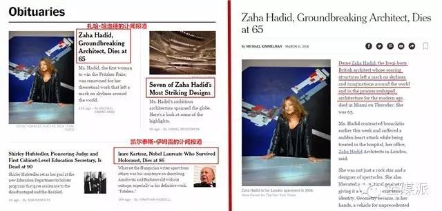 《纽约时报》讣告版刊登了凯尔泰斯·伊姆雷与扎哈·哈迪德的讣闻报道。此外,它还盘点了扎哈·哈迪德最出名的七个设计品,以此来纪念逝者。