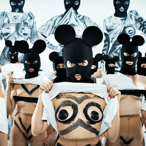 她们戴着黑色米奇头套,有点抢劫犯的味道;一只手满不在意将T恤拉高露出胸部,像是举起武器要向整个世界叫嚣——