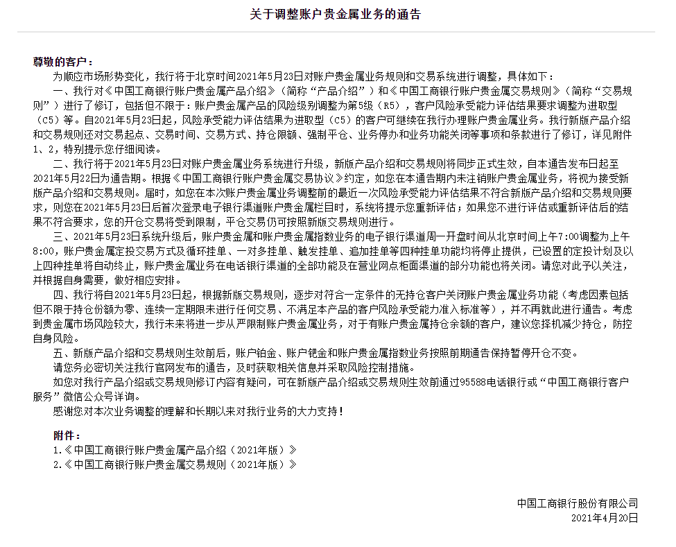 4月20日,工行在官网发布公告称,将对《中国工商银行账户贵金属产品介绍》和《中国工商银行账户贵金属交易规则》进行了修订,包括但不限于:账户贵金属产品的风险级别调整为第5级(R5),客户风险承受能力评估结果要求调整为进取型(C5)等。自2021年5月23日起,风险承受能力评估结果为进取型(C5)的客户可继续在工行办理账户贵金属业务。工行将自2021年5月23日起,根据新版交易规则,逐步对符合一定条件的无持仓客户关闭账户贵金属业务功能。