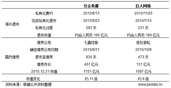 按照重组方案重组后的公司总股本来计算,相比于在美股退市时的市值,回到A股的分众传媒和巨人网络市值都出现了较大幅度的上升,截至2015年年底,分众传媒市值增长近11倍,而巨人网络市值也增长了6倍左右。