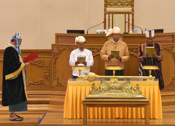 3月30日,在缅甸内比都,当选总统吴廷觉<右二>、第一副总统吴敏瑞<左二>和第二副总统亨利班提育<右一>在联邦议会议长曼温凯丹面前宣誓就职。 新华社发/缅甸宣传部供图