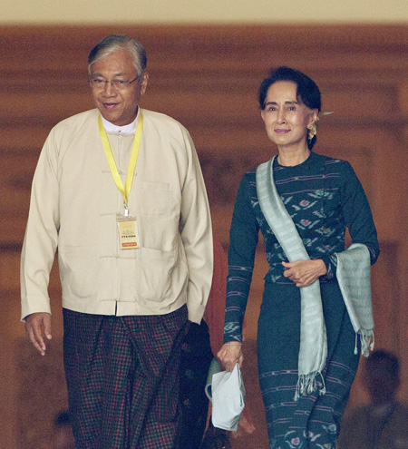 3月15日,缅甸新任总统吴廷觉<左>与昂山素季步出议会。 图/美联社
