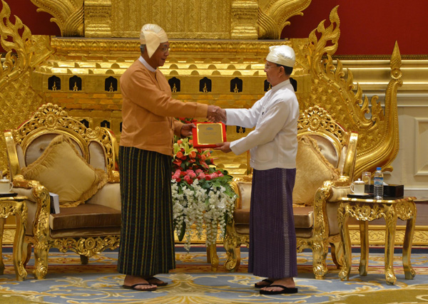 3月30日,在缅甸内比都的总统府,卸任总统吴登盛<右>和新任总统吴廷觉<左>完成权力交接。 新华社发
