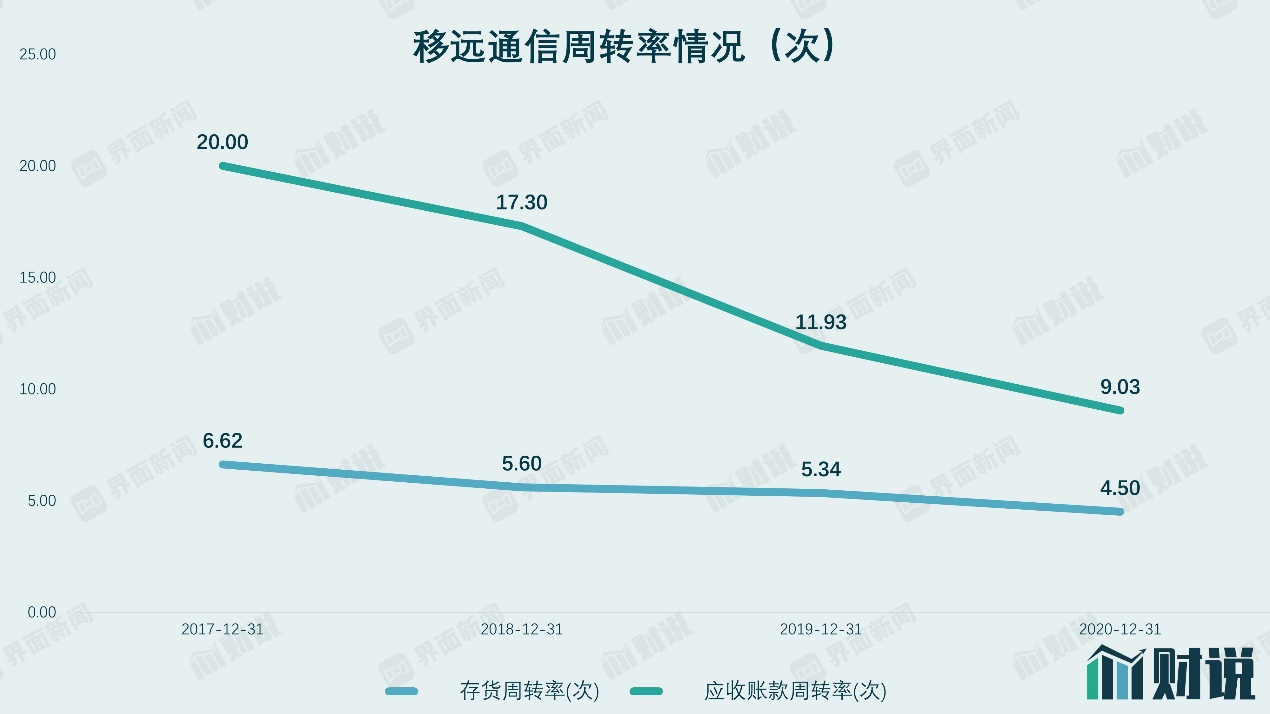从关键财务指标看,移远通信呈现恶化态势。公司存货周转率和应收账款周转率连续三年下滑,存货周转率从2017年的6.6次下降到2020年的4.5次,应收账款周转率从2017年的20次下降至2020年的9次。