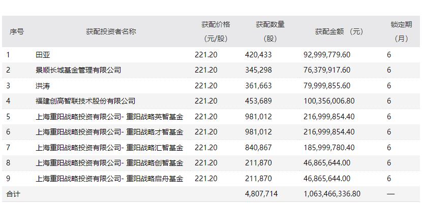 从最终结果看,获配的机构投资者有景顺长城基金管理有限公司、重阳投资和创高智联(831464.OC)。其中,重阳投资下注最重,合计投资金额接近7.14亿元。重阳投资由裘国根创立,是国内老牌明星私募之一。