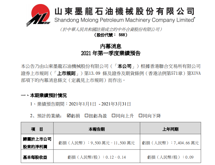 4月14日,山东墨龙官网发布“2021年第一季度业绩预告”。预告期内,归属于上市公司股东的净利润亏损9500 万元–1.15亿元,基本每股收益亏损0.12–0.14元/股。