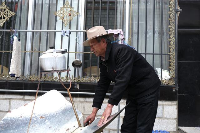 金珠用太阳灶烧水(3月26日摄)。 新华社记者 格桑边觉 摄
