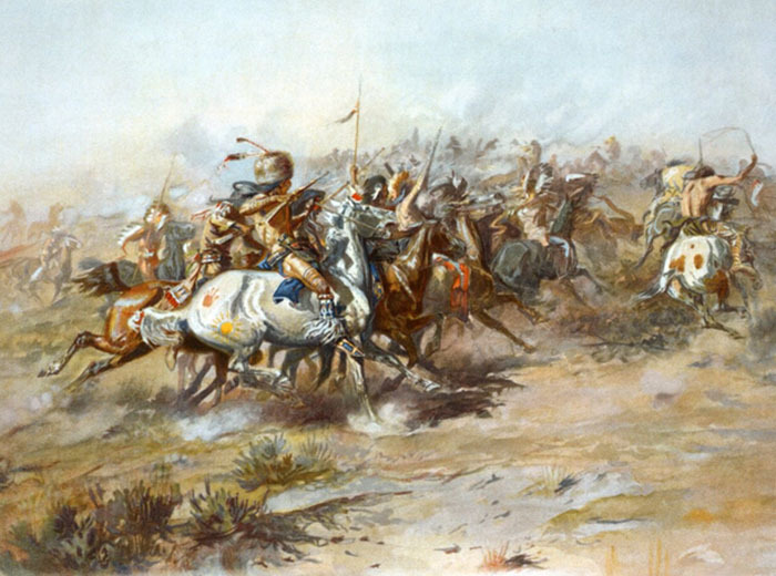2. 查尔斯·马里昂·罗素的作品《卡斯特战役》,创作于1903年 Medicine Crow的继祖父White Man Runs Him曾是乔治·阿姆斯特朗·卡斯特将军手下的六名侦察兵之一,并跟随将军在1876年远征过苏族和北夏安族人。 这场远征的高潮是在1876年6月爆发的小大角河战役。