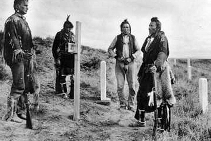 3. 大约在1913年时,克劳人的侦察兵重返卡斯特之战的战场。由左至右: White Man Runs Him, Hairy Moccasin, Curley, Goes Ahead Medicine Crow与这场战役之间的联系,以及他长寿的人生使得他成为了那些直接听到过小大角河战役参与者口述的人中,最后一位活着的人。