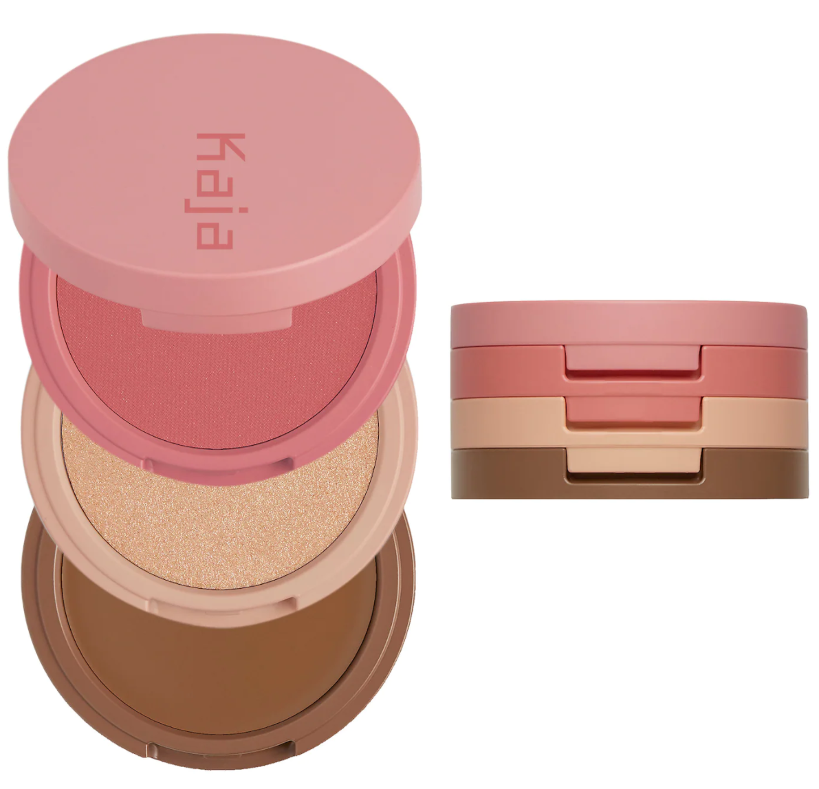 Kaja全新面部彩妆盘沿袭了品牌眼影经典的层叠式圆柱设计,小巧可爱。彩妆盘共三层,分别是腮红、高光和修容,均为奶油质地,顺滑易推开,可以快速完成上妆或补妆。彩妆盘共推出三个不同色号:Butter Up、Cloud Latte和Mochamallow,可以适应不同肤色的需求。