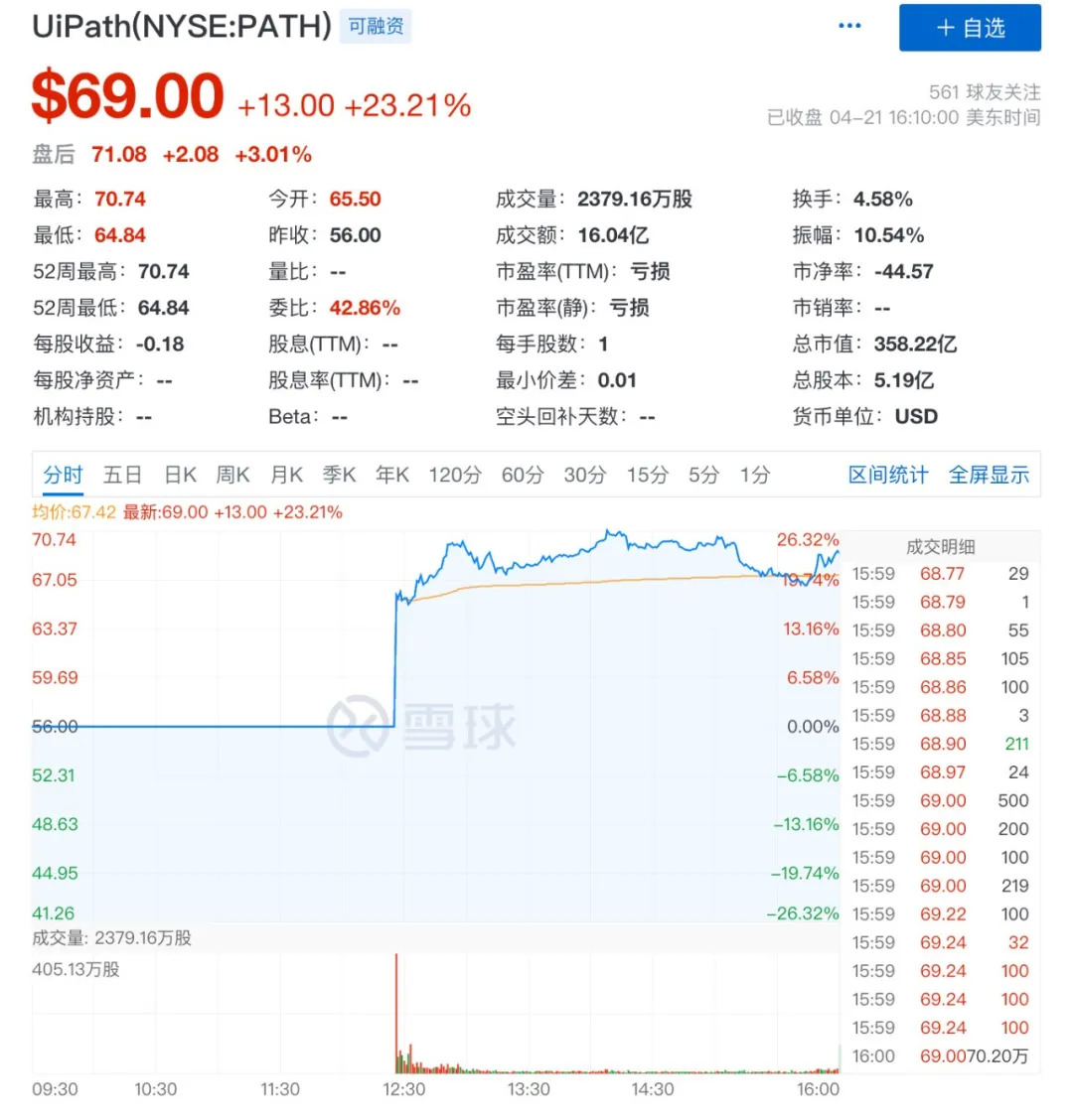 早在一周之前UiPath已经对股价进行过一次调整,将每股从43美元至50美元的大范围上调至52美元至54美元的小范围,发行的股票数量从2130万股增加到2390万股。由于市场对PATH股票的需求高于预期,UiPath在上市前一天,又将股价上调股价至56美金。