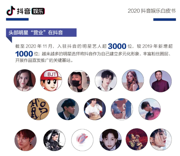 根据《2020抖音娱乐白皮书》,2020年入驻抖音的明星艺人超过3000位,吸引了包括流量大咖、当红小鲜肉、经典明星、偶像爱豆等各类明星入驻。