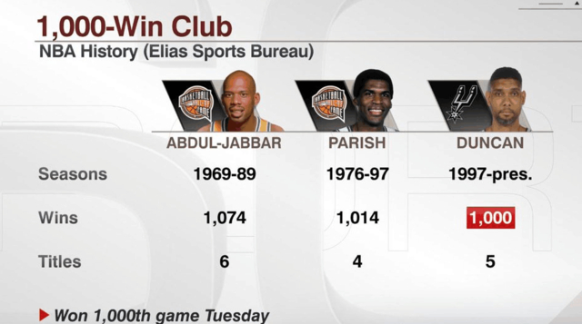 邓肯今天数据不佳,得到3分2篮板2助攻2盖帽,但是依然完成里程碑。他是历史上第三个拿到1000胜的球员,另外两个是贾巴尔和帕里什。贾巴尔一共拿到1074胜,帕里什拿到1014胜。另外,邓肯拿到5个冠军,多于帕里什(4个)少于贾巴尔(6个)。