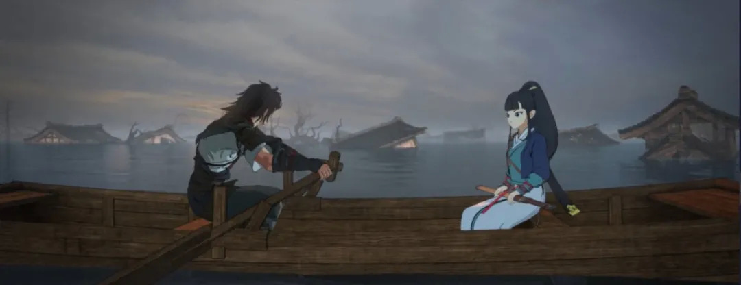 实际上,《枕刀歌》的创作者也深谙这一点。动画第五集“江海一阔见苍生”是唯一没有打戏的一集,在这集里主角和救下的小女孩路遇黄河水灾,在彼岸寺回想起二人幼年时截然不同的境遇——一人是当朝要臣之子,一人是逃荒人家之女,而今长大成人后携手共闯江湖,不免令人唏嘘。这段情节同时也为解释主角之父被杀的原因作了铺垫,当主角最终站在他以为的幕后主使面前,却发现真相并非那么简单,自己不仅陷入了幕后黑手设下的圈套中,“为家还是为国”更是成为了他报仇之路必须的抉择。