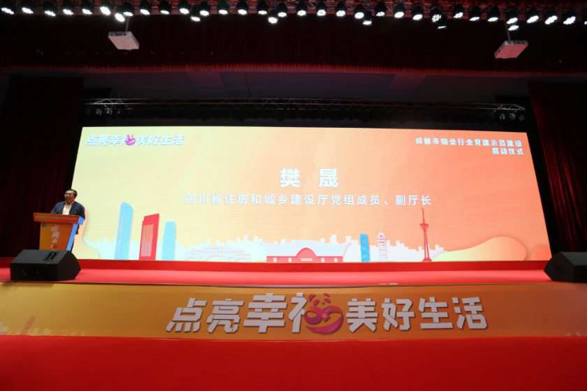 2021年4月23日,由四川省委组织部、省住建厅指导,成都市委组织部、市委社治委、市财政局、市住建局、市总工会、团市委、市妇联主办,锦江区委组织部、区委社治委、区住建和交通局承办的“点亮幸福美好生活——成都市物业行业党建示范建设启动仪式”在成都市圆满举行。四川省委两新工委专职副书记尹显耀,四川省住房和城乡建设厅党组成员、副厅长樊晟,成都市委常委、组织部部长、社治委主任邓涛出席活动。