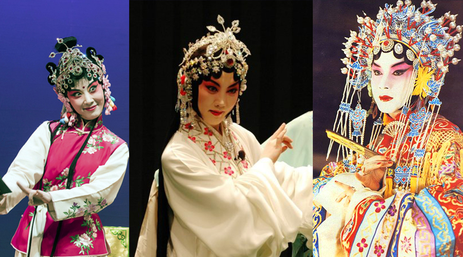 “她们”分别是:《西厢记》中的丫鬟红娘、《白蛇传》中的白素贞、电影《霸王别姬》中的张国荣扮演的虞姬。从左往到右看,服装和扮相越来越正式、雍容,人物的身份地位也越来越显赫尊贵。