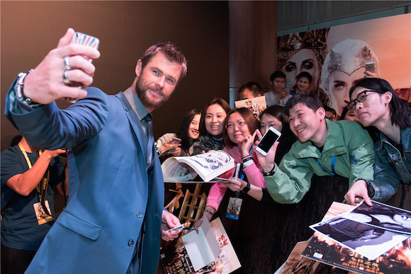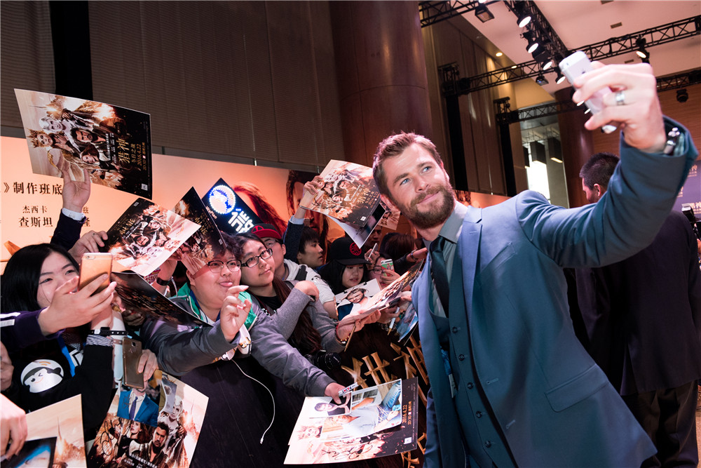 发布会开始前,第一次来到中国的克里斯·海姆斯沃斯显得格外激动,细心关照红毯一旁失去理智的影迷粉丝。