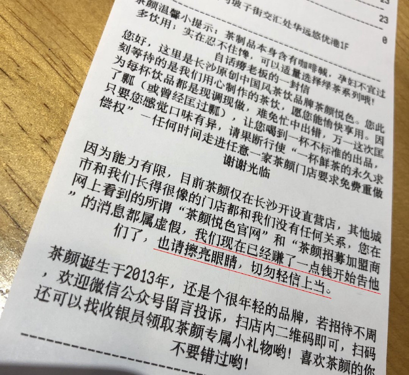 “等我们有钱了就去告他们”,这是2017年茶颜悦色的小票上印着的一句话,茶颜悦色的“山寨版”茶颜观色正是在这一年开始大肆扩张。到2019年,这句话变成了“我们在现在已经赚了一点钱开始告他们了”。