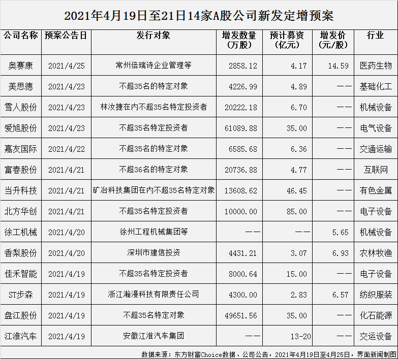 2021年4月19日至4月25日,该周,共有14家A股上市公司发布新的定增计划,合计募资额262.23亿元至269.23亿元。