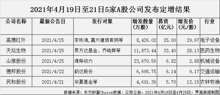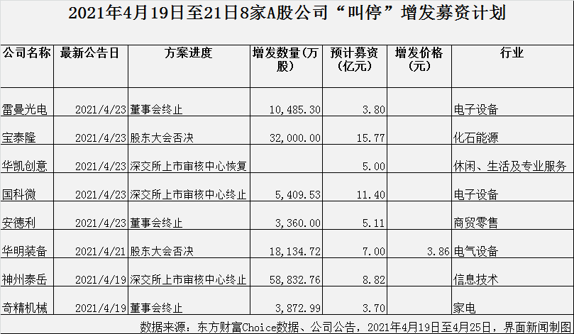 2021年4月19日至21日,8家A股上市公司“叫停”了增发募资计划,涉及募资额超60亿元。