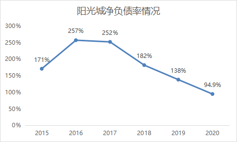 不过,阳光城激进扩张的做法还是留下了痕迹。以净负债率这项数据为例,2016年末,公司净负债率由171%陡升至257%,2017年引入“双斌”后,净负债率实现连年下降,直到2020年才降至100%的红线以内。