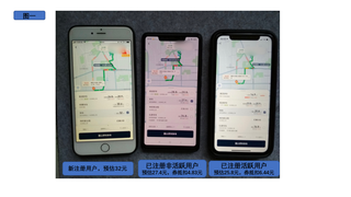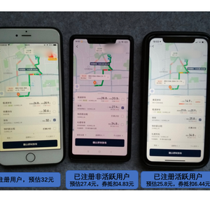 针对这个调研结论,以滴滴快车为例,来咖智库也做了同样一个小测试,但发现了不一样的结果。比如考虑到新老用户的不同,我们将用户分成新注册、已注册非活跃和已注册活跃这三类用户,在同一时段、同一目的地发单打车,页面上呈现的预估价格是不同的,但这个不同是因为有优惠券的存在,如果扣除优惠券的话,那么整体预估价都是32元,仅有0.2元的小差距(见图一)。