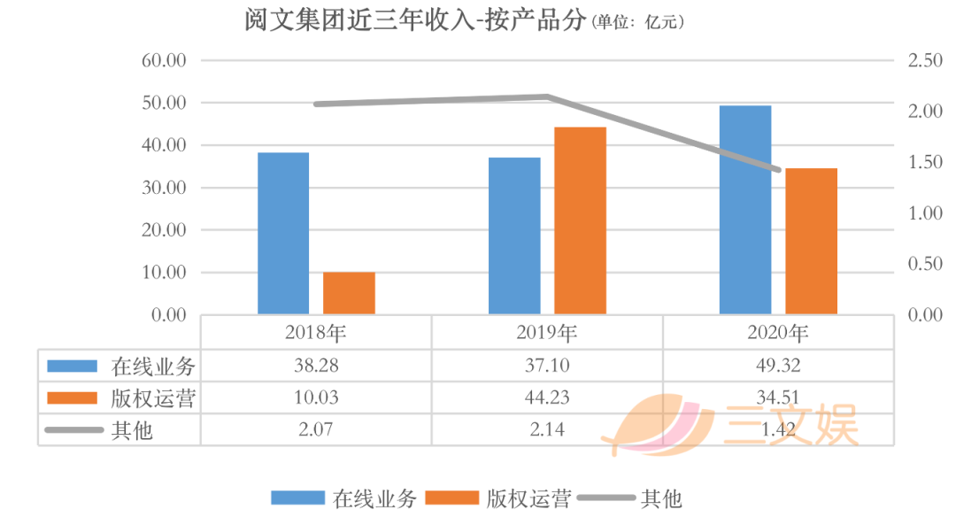 阅文集团将业务分为在线业务和版权运营及其他这两部分。2020年在线业务收入同比增加32.9%至49.32亿元,占总收入57.9%;版权运营及其他收入也有35.94亿元,同比减少22.5%。