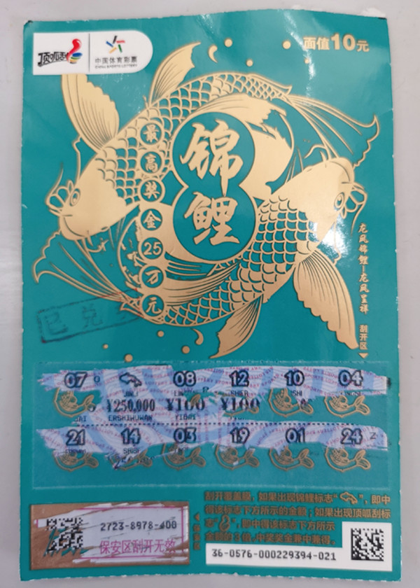中奖彩票出自位于鄞州东钱湖镇沙家垫市场十字路南面1号的3302019075体彩实体店。据中奖者小付的妻子称,中奖彩票是小付下班后到店里随手买的,一开始购买了三张面值10元的“锦鲤”,刮出30元后,又换购了三张面值10元的“锦鲤”,未曾想其中一张出了个25万大奖。