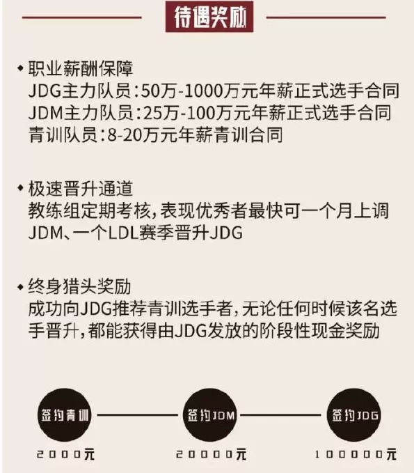 2019年的时候,JDG俱乐部曾经在微博上发布了一份招聘信息,其中给出了对于队员的具体薪资,一线队年薪50万-100万,二线队也就是LDL联赛中的JDM是25万-100万,而青训是8万-20万。
