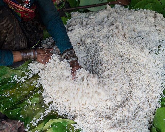 米饭是这个部落中非常重要的食物,一位拉乌特族的女人正在晾干煮熟的米饭,准备用它来酿酒,为即将到来的庆典做准备。