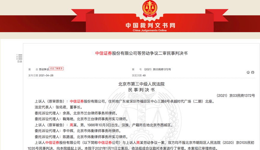 4月28日,中国裁判文书网披露的一则中信证券的劳动争议二审判决,透露出券业“老大哥”中信证券研究部门的薪资水平和考核标准。