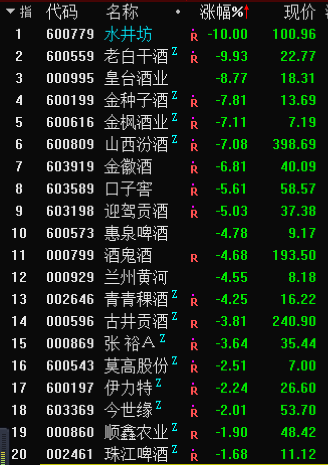 盘面显示,截至4月29日上午收盘,酿酒板块36只票,只有28只飘红,跌幅最深的是水井坊(600779.SH),在上午开盘10点左右,便被砸至跌停;老白干酒(600559.SH)截至上午收盘时的跌幅也有9.93%,其股价上午大部分时间都挣扎在跌停位一带。