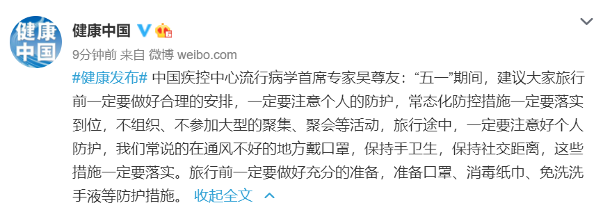 据@健康中国 微博消息,中国疾控中心流行病学首席专家吴尊友:“五一”期间,建议大家旅行前一定要做好合理的安排,一定要注意个人的防护,常态化防控措施一定要落实到位,不组织、不参加大型的聚集、聚会等活动,旅行途中,一定要注意好个人防护,我们常说的在通风不好的地方戴口罩,保持手卫生,保持社交距离,这些措施一定要落实。旅行前一定要做好充分的准备,准备口罩、消毒纸巾、免洗洗手液等防护措施。