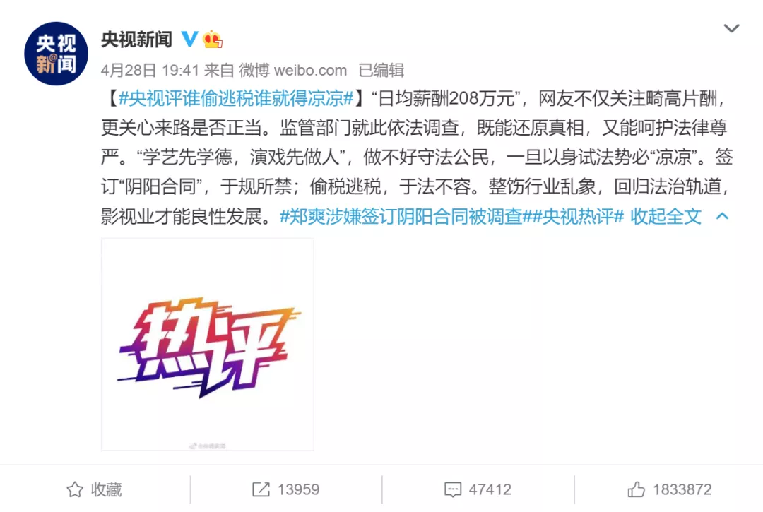 4月28日,央视新闻微博发表评论称:“日均薪酬208万元”,网友不仅关注畸高片酬,更关心来路是否正当。监管部门就此依法调查,既能还原真相,又能呵护法律尊严。“学艺先学德,演戏先做人”,做不好守法公民,一旦以身试法势必“凉凉”。签订“阴阳合同”,于规所禁;偷税逃税,于法不容。整饬行业乱象,回归法治轨道,影视业才能良性发展。
