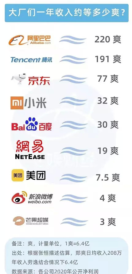 也有网友按照郑爽在《倩女幽魂》中的日收入计算出其年收入为6.4亿,把该金额算作一“爽”(网友拟定的计量单位),并和互联网公司的收入作了比较。