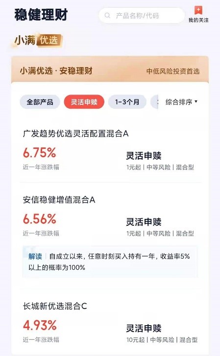 度小满金融承继百度AI技术基因,旗下度小满理财App通过大数据、人工智能等优势能力,合作优质基金公司上线了众多好基。近期,度小满理财(原“百度理财”)推出了三款“固收+”类产品,投资者只要下载并注册登录度小满理财App,在首页下方按钮点击“稳健理财”,进入版块后找到“小满优选·安稳理财”推荐栏,选择灵活申赎,即可看到。