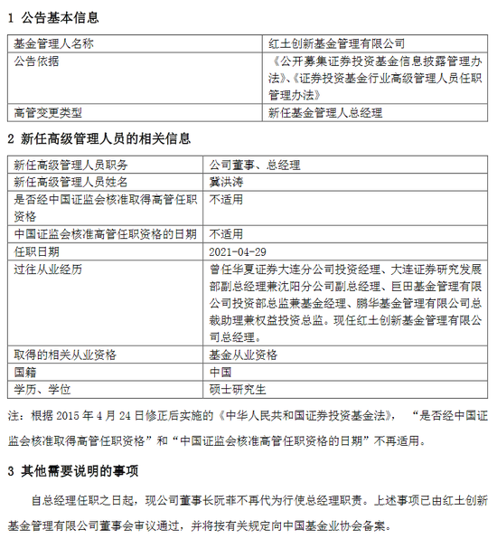 今日,红土创新公司发布高级管理人员变更公告,新任冀洪涛为公司董事、总经理,任职日期2021年4月29日。在2020年10月30日红土创新基金前任总经理高峰离职后,该公司总经理一直由董事长阮菲代任至今。自总经理任职之日起,现公司董事长阮菲不再代为行使总经理职责。