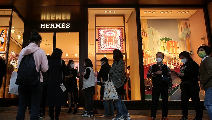 发放优惠券活动开始后,海港城内多个奢侈品牌门店前排起长队,部分热门品牌的排队时间甚至长达五个小时,而类似的情况也在2020年海港城爱马仕门店重装开业的时候出现。