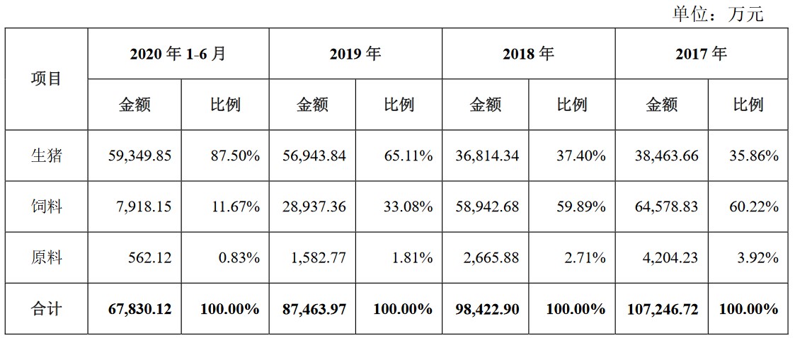 新农科技主营业务收入主要来源于生猪、饲料以及饲料原料业务,其中生猪与饲料是公司最主要的收入来源,报告期内占公司总收入比重在95%以上。不过,报告期内公司生猪业务的销售占比增长迅速,分别为35.86%、37.40%、65.11%和87.50%。