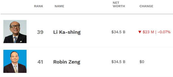 但根据5月4日晚间8点左右福布斯全球富豪榜的实时榜单数据,李嘉诚的最新身价增长至345亿美元,与曾毓群相同。该榜单显示,李嘉诚的排名高于曾毓群,位列全球富豪榜第40位,曾毓群则退居第41位。