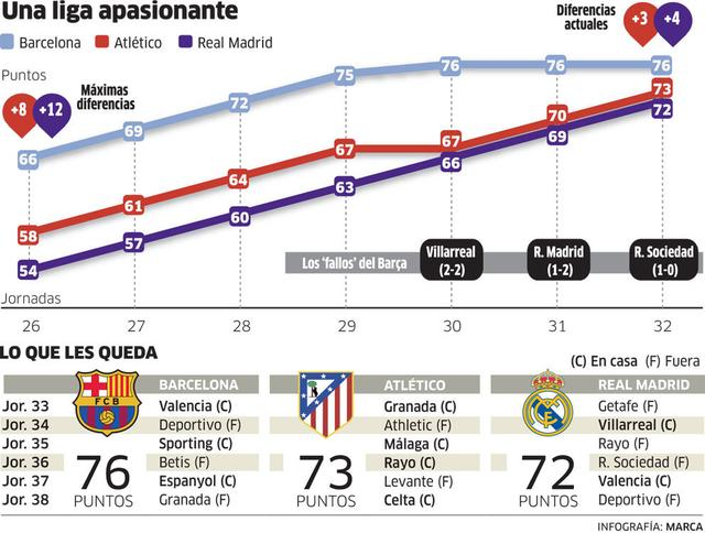一个月之前,状态如日中天的巴萨在主场6-0横扫赫塔菲之后,豪取联赛12连胜,在联赛还剩9轮的情况下,领先第二名马竞8分,卫冕联赛冠军看似已是探囊取物。然而,继2-2被比利亚雷亚尔逼平,主场输掉同皇马的国家德比,本轮又被号称“西甲黑社会”的皇家社会“习惯性”爆冷,巴萨若还想拿到西甲冠军,留给他们犯错的机会真的不多了。