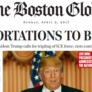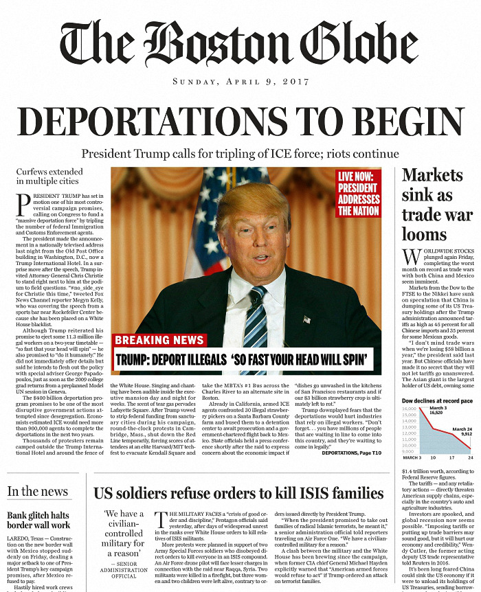 “这就是特朗普当选总统后的美国。您所读到的,便是这位共和党总统竞选人理念付诸实践、狂言化为行动后美国社会的模样。或许不少美国人觉得这份伪头版别出心裁,但《波士顿环球报》编委会却为此深感担忧。”