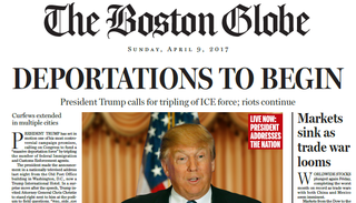 4月10日,《波士顿环球报》周日版制作了一版辛辣头条,让读者看看要是特朗普当选下任总统,未来的美国究竟是何等光景。