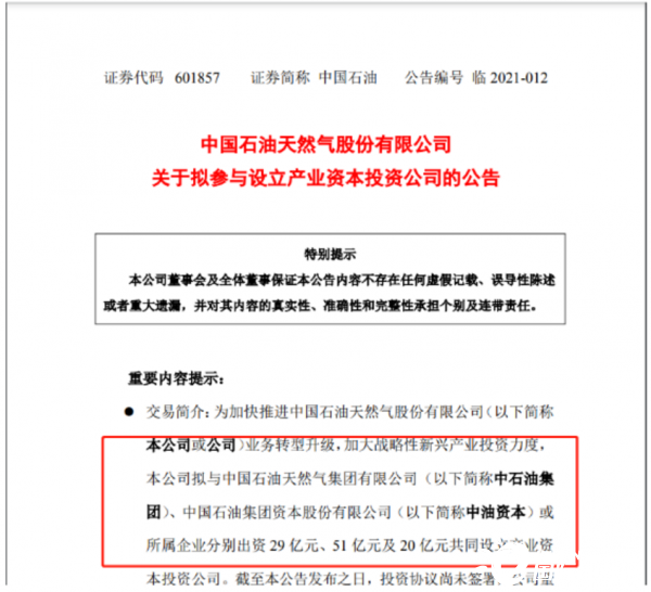 4月30日,中国石油天然气股份有限公司(以下简称“中国石油”)发布公告,中国石油拟与中国石油集团公司、中油资本共同投资100亿设立产业资本投资公司,公司名称为中国石油集团昆仑资本有限公司,股权分配分别为29%、51%、20%,出资金额分别为29亿元、51亿元、20亿元。未来三年,三家股东将按照3:3:4的比例,三年内完成实际出资。