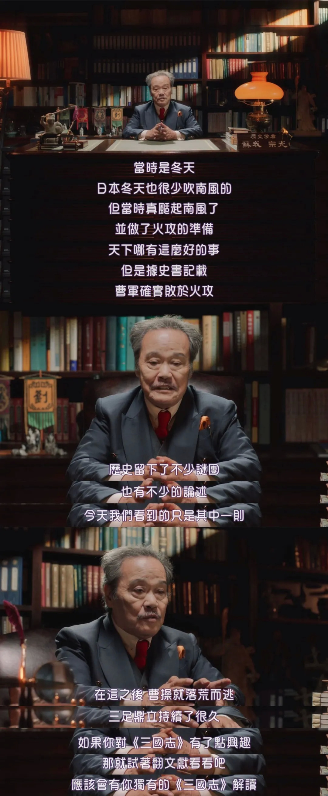 当整部电影接近尾声时,这位虚构的历史学家在简单点评了赤壁之战后,还向观众给出了自己的建议: