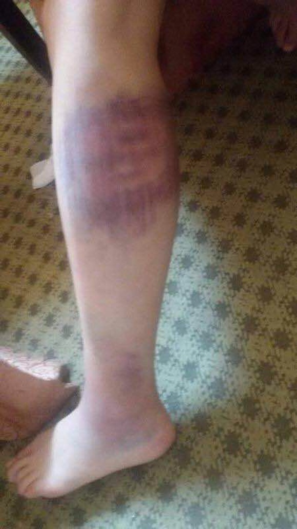 (张奎梅曾拍下当时张晓燕的伤痕,这样的淤青遍布全身,彼时张晓燕的左小腿已经骨折)