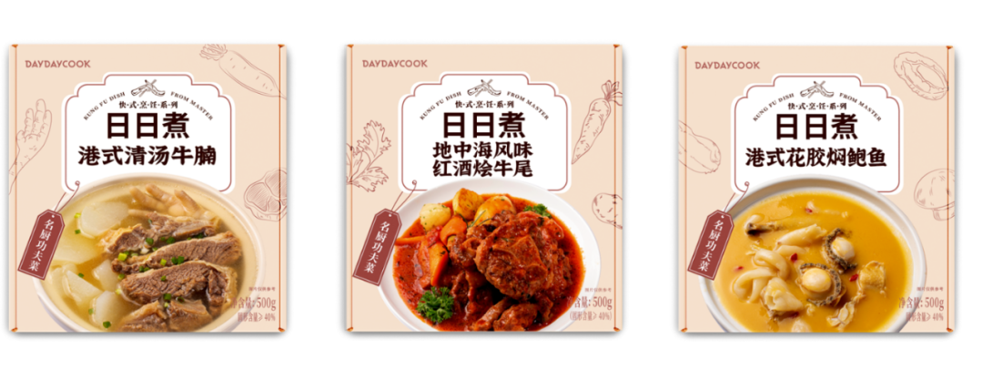 今年4月,日日煮推出了他们的冷冻功夫菜。这一系列包含三款制作过程极度复杂的美味菜肴:港式清汤牛腩、红酒焖牛尾和港式花椒焖鲍鱼。采用冷冻料理包的方式,简化制作流程,极大地满足了新世代消费者的需求。