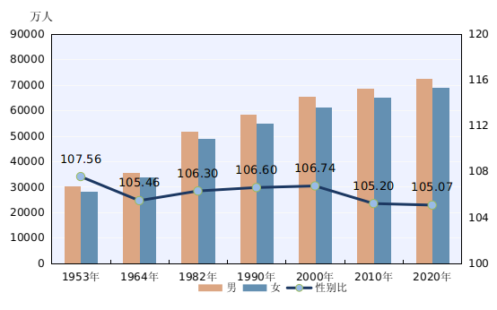 性别结构持续改善。男性人口为72334万人,占51.24%;女性人口为68844万人,占48.76%。总人口性别比(以女性为100,男性对女性的比例)为105.07,与2010年基本持平,略有降低。出生人口性别比为111.3,较2010年下降6.8。