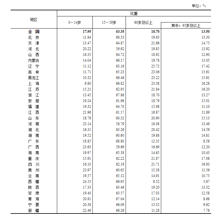 在人口继续保持低速增长态势的同时,人口老龄化程度进一步加深。第七次全国人口普查结果显示,0-14岁人口为25338万人,占17.95%,比2010年上升了1.35个百分点。15-59岁人口为89438万人,占63.35%,比2010年下降了6.79个百分点;60岁及以上人口为26402万人,占18.70%(其中65岁及以上人口占比13.50%),比2010年上升了5.44个百分点。