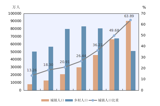 新型城镇化进程稳步推进。居住在城镇的人口为90199万人,占63.89%;居住在乡村的人口为50979万人,占36.11%。与2010年相比,城镇人口增加23642万人,乡村人口减少16436万人,城镇人口比重上升14.21个百分点。